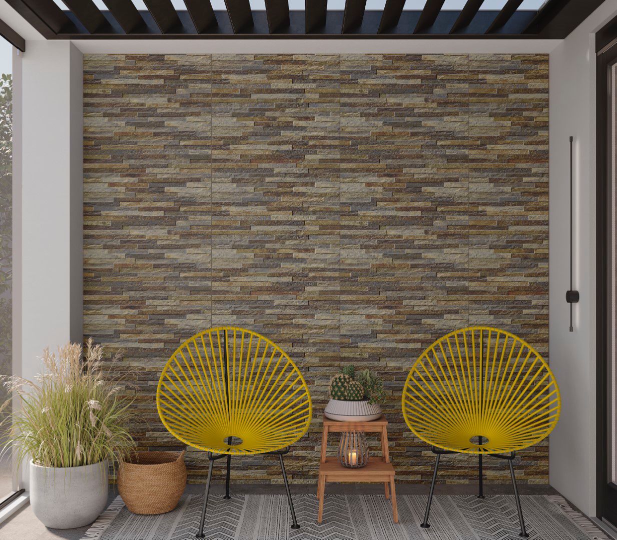Cerámica en formato 39×75 cm con diseño tipo piedra laja en tonos óxido, beige y gris. Su acabado rústico imita la textura y apariencia de la piedra natural, aportando fuerza y personalidad a cualquier espacio. Ideal para fachadas, muros exteriores o paredes decorativas interiores, combina resistencia con un estilo atemporal. Cada caja contiene 7 piezas que cubren un total de 2.06 m², lo que facilita la planificación y el cálculo del material.